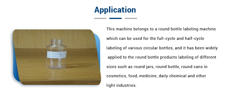 本機屬於圓瓶貼標機,可用於各種圓瓶的全週期和半週期貼標,已廣泛應用於圓罐,圓瓶等不同尺寸的圓瓶產品貼標。 ,化妝品,食品,醫藥,日化等輕工業的圓形罐。